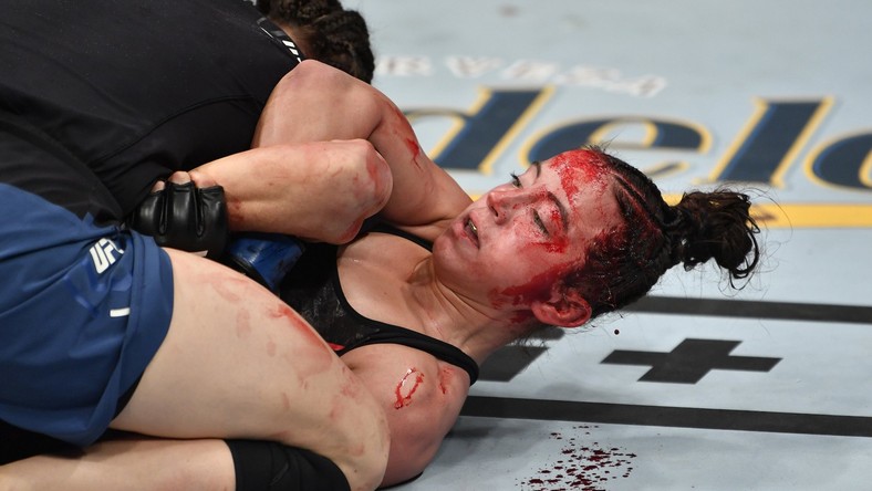Modafferi knocked Barber down in round two, made her bleed all over the canvas, and before the third round began, there was a question mark over whether Barber could even continue, with the doctor saying she had suffered a small ACL tear.